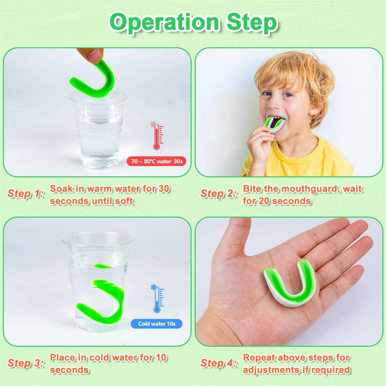 Put the mouth guard into warm water (75 degree) till soft for about 30 seconds. 2. Once it is soft, insert it to your upper teeth in mouth. 3. Mouth bite down and use fingers to finalize shaping process for 20 seconds. 4. If teeth protector fits to your mouth, clean it and put into cold water for 10 seconds. 5. If it is not fit to your mouth, you can fix it again from step 1. 6. If the size is a little different, use a knife or scissors to remove the excess.