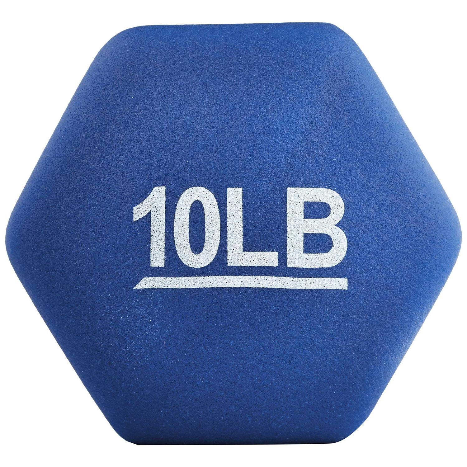 Hand weights with dumbbells for resistance training and exercise; perfect for home gyms, fitness centers, or workout spaces Contains two dumbbells in navy blue, each weighing 10 pounds (4.5 kg) (20 pounds/9 kg in total). Neoprene covering to provide a firm, non-slip hold Each end cap has a printed weight number for easy identification. Dumbbells are kept from rolling away by their hexagonal form. The product’s dimensions (LxWxH) are roughly 21.84×10.16×10.16 cm.