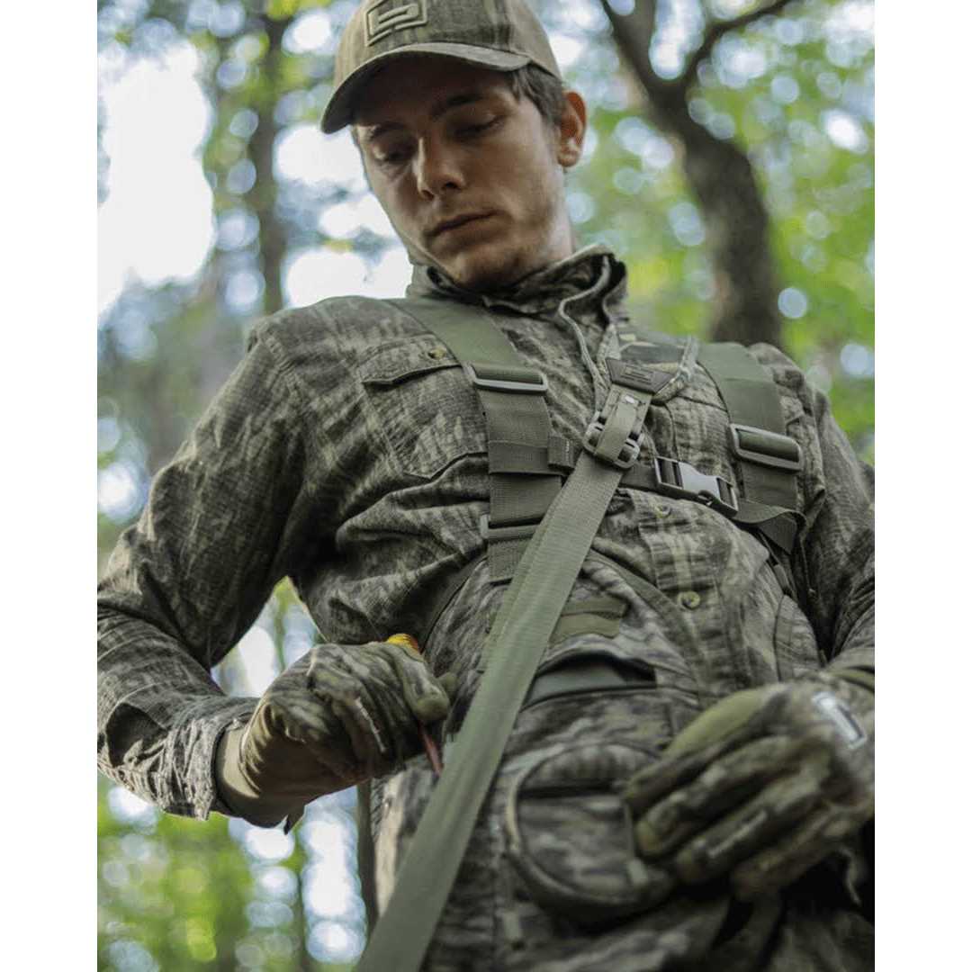 Ultra lightweight and quiet brushed tricot construction Straps made from heavy-strength military grade webbing Reinforced shoulder grip comfortably holds straps in place Comfortable mud proof padded seat with easy up and down clips Built-in decoy/blind/game large back compartment for maximum storage capacity Essentially lightweight, handy, and comfortable. The pocket storage you need built on minimal design for the run-and-gun, agile hunter. Sit comfortably with the quick-drop mud proof padded seat. Walk out of the woods with ease, and hands-free hauling the turkey in a streamlined decoy/blind/game blood-proof rear compartment.