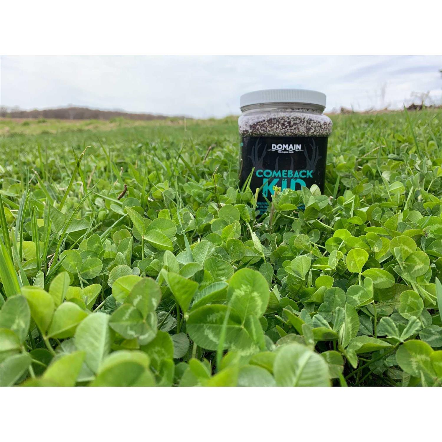 Domain Comeback Kid is loaded with a mixture of cold-season perennials and annuals. This protein-rich, tonnage-producing clover mix is designed for year round food production and attraction for deer and turkey. By combining special varieties of clover and alfalfa, this perennial mix will establish quickly and last up to 5 years. Comeback Kid contains 4 special varieties of clover and 1 variety of alfalfa to create an absolute deer magnet and provide forages with protein levels above 30%. Periodic mowing helps eliminate unwanted weeds and generates re-growth of the clover and alfalfa, keeping them strong and healthy. During this growth stage, Comeback Kid will provide the highest level of nutrition and deer activity. Comeback Kid is designed to be the foundation of your food plot program. Its high protein forages will be the first to germinate in the spring and are extremely cold tolerant into the dead of winter. – Premier perennial mix – 4 varieties of clover and 1 of alfalfa – Provides high protein forage for up to 5 years – One 3.75-lb. jug plants 1/2 acre Establishes quickly and will last up to 5 years Provides forages with protein levels above 30% | Domain Outdoor Domain Comeback Kid Food Plot Mix, 3.75 lbs