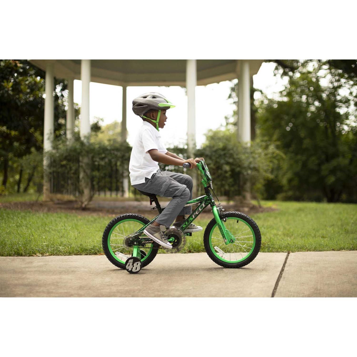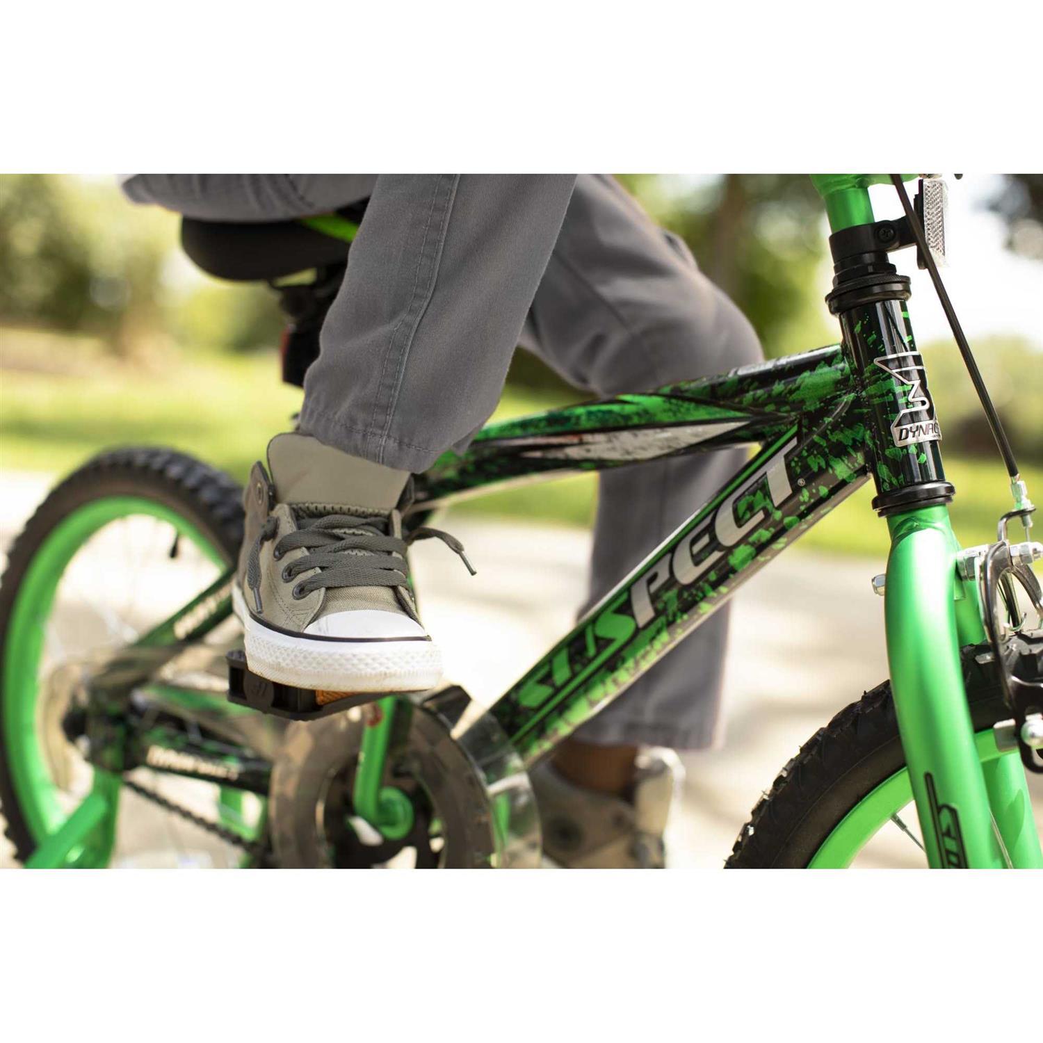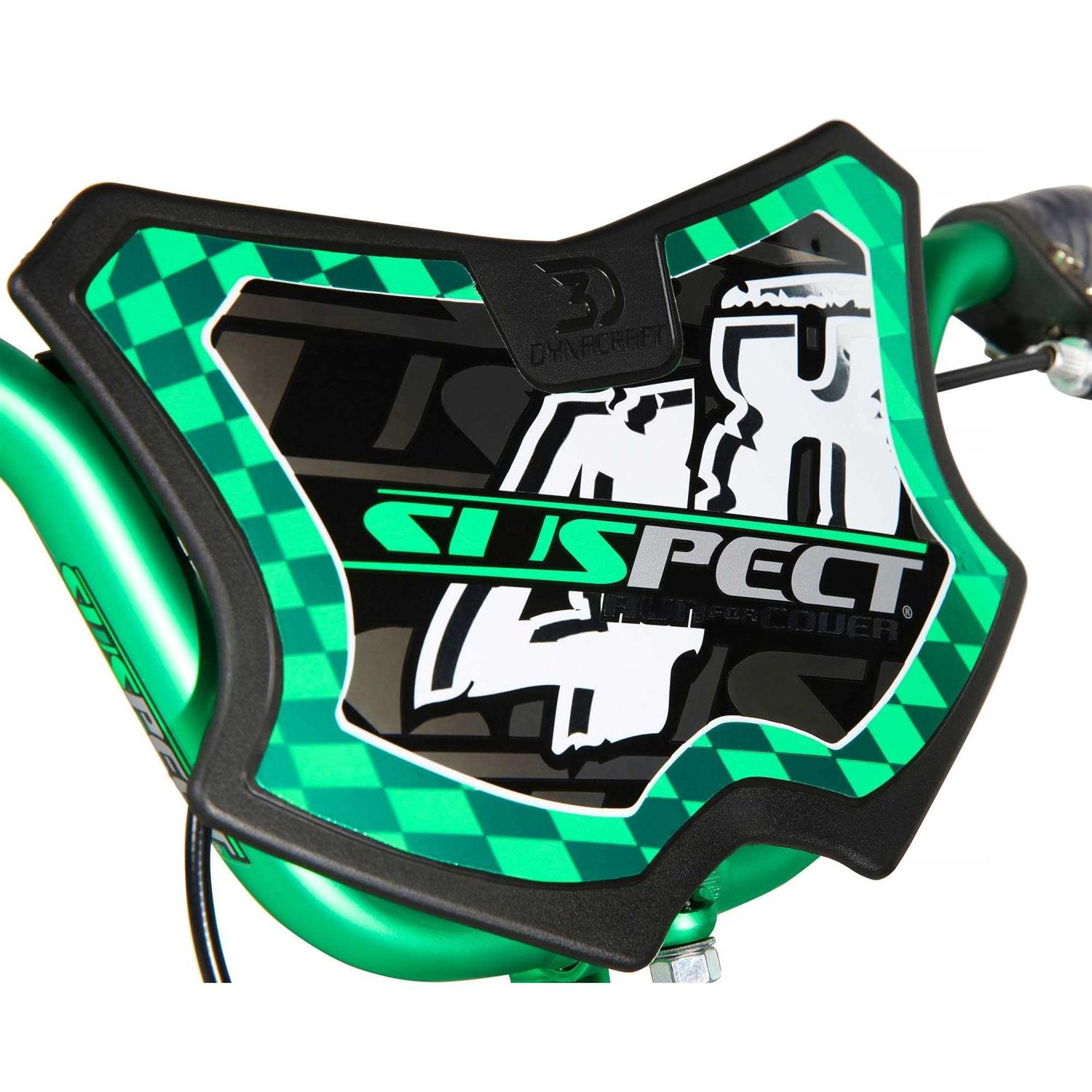 This awesome ride features a matte black frame with vibrant green handlebars, fork and rims. The young rider can ride in comfort with the padded saddle, folding pedals and comfort handlebar grips. This reliable 16 inch bike is equipped with a durable steel frame and front caliper and rear coaster brake. The quick release training wheels allow your rider to grow into a two-wheel bike whenever they are comfortable. The Dynacraft 16 inch Suspect bike will allow him to go on many adventures and have hours of fun!