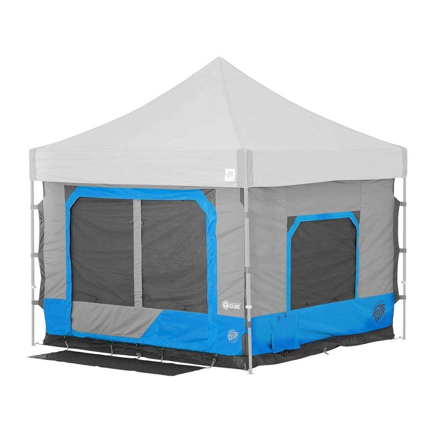 The camping cube outdoor pop-up tent add-on is a spacious & easy to set-up product ready for your next fun trip. Camping cube add-on is not self-standing. Turn your existing E-Z up shelter pop-up tent into a camping haven. This isn’t your average add-on in literally S, not Min, you can transform your E-Z up shelter into an entirely new space with standing room capacity. Additional features include an oversized entry door for easy access, 3 large windows for ventilation, 3 weather resistant power pockets, O-ring attachment points to hang your lights, heavy duty E-Z zipper pulls, & a footprint entry Mat to keep your camping cube clean. So, whether youre looking for shade or a Complete nights rest safe from the elements the E-Z UP camping cube add-on have you covered.