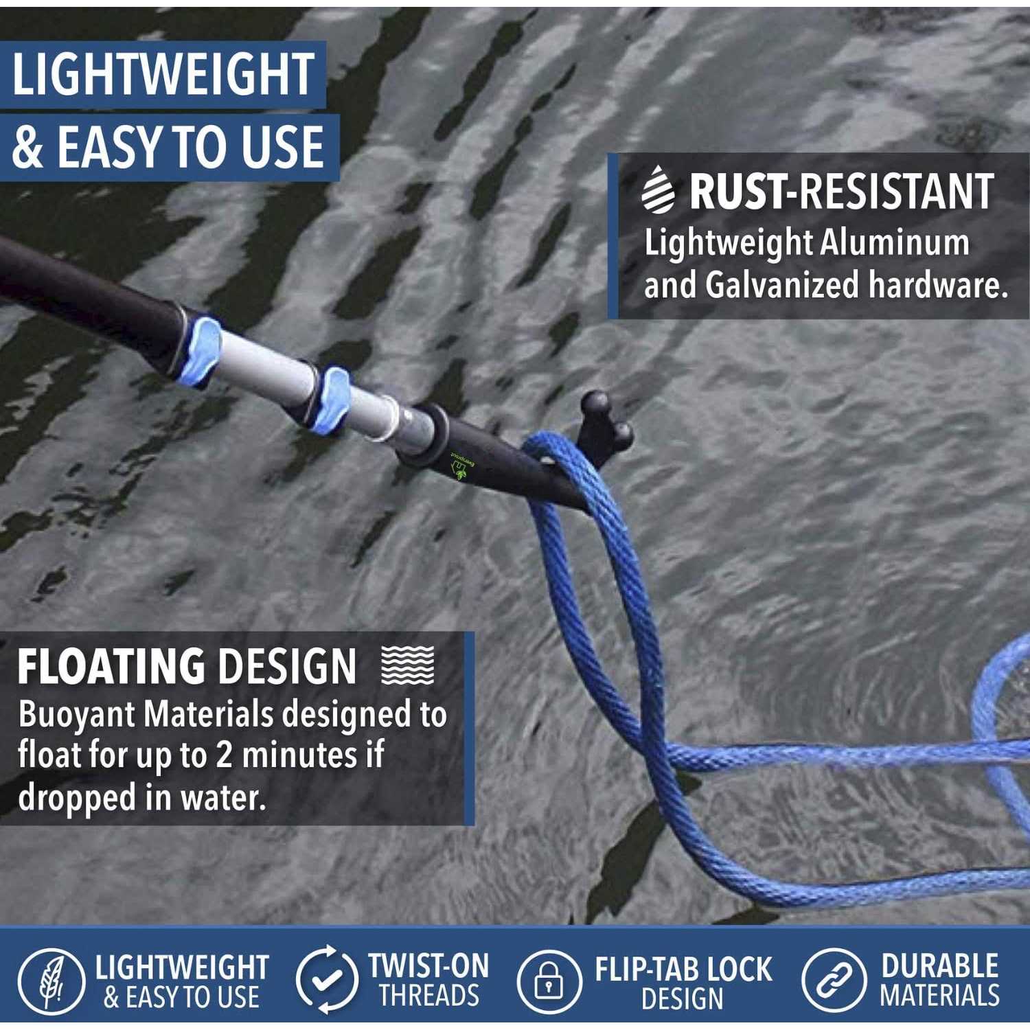 Boat hook+ extension pole in 3′, 12′, 18′, or 24′ safely brings items within reach. Our tool is sturdy, yet lightweight and floats up to 5 minutes. Rust-resistant technology with a non-slip hand grip. Extend with flip-tab locking for a custom length.