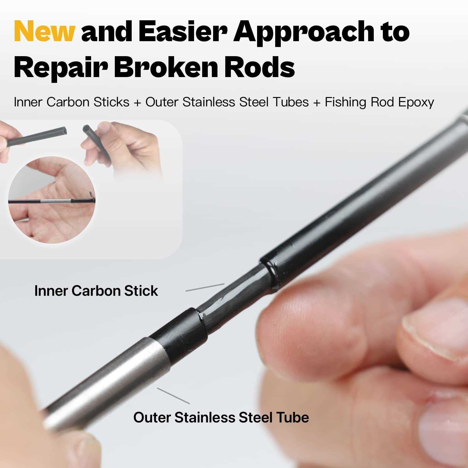 A complete fishing pole repair kit with inner carbon fiber stick and outer stainless steel tube to repair broken fishing pole with out diameter from 2.4mm to 10.6mm which covers most cases. More sturdy and powerful repair with outer stainless steel tube (31 different sizes) and inner carbon fiber stick (8 different sizes) insert. Easier repair process takes less than 20 minutes to finish a repair. Can repair most of broken fishing rods with Gook-Looking result, repair instructions included for your first repair. Fit both freshwater and saltwater fishing rods, as well as fly rods. This fishing pole repair kit with glue is a easy, quick & good- looking approach to repair a broken fishing rod.