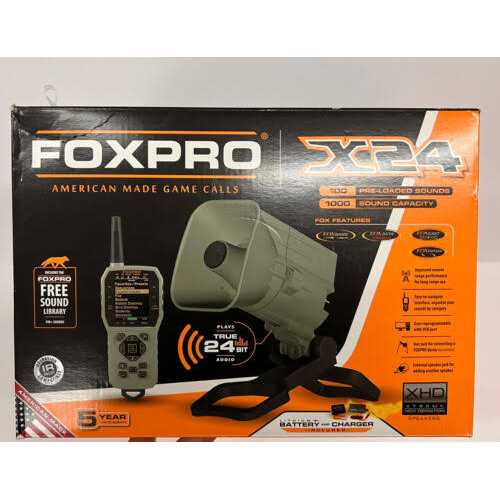 The FOXPRO X24 is powerful and compact. It features a positional Xtreme High Definition (XHD) speaker that is a horn speaker with an added tweeter for improved frequency response. The speaker system allows for extreme volume capabilities and realistic sound clarity. The X24 handle folds out into a positional stand to provide elevation over various terrains that you might encounter. There is one external speaker jack if you desire more volume, an auxiliary jack to connect an approved device such as a Jack Predator Decoy (sold separately), and a charge jack. The X24 comes with 100 high-quality FOXPRO sounds and 100 sounds from FOXPRO? s Free Sound Library, with the ability to store and access up to 1000 sounds. The X24 comes with a lithium battery and charger kit. The TX1000 features a full color graphic LCD screen, which displays your sound list or sound categories. It also has a barometer indicator, moon phase indicator, temperature indicator, battery level indicator, and a timer or time clock. Upon discharging a firearm, FOXBANG automatically reacts by engaging a predetermined setting. FOXDATA allows you to record real time information from your hunt so you can access the data for future reference; track key stand data from your hunts such as temperature, barometric pressure, sounds used, etc. FOXMOTION allows you to fade the sound from the left speakers to the right speakers to help sell the reality of your call sounds. Use FOXCAST to develop your own custom calling sequences defining an entire stand from start to finish for hands-free calling.