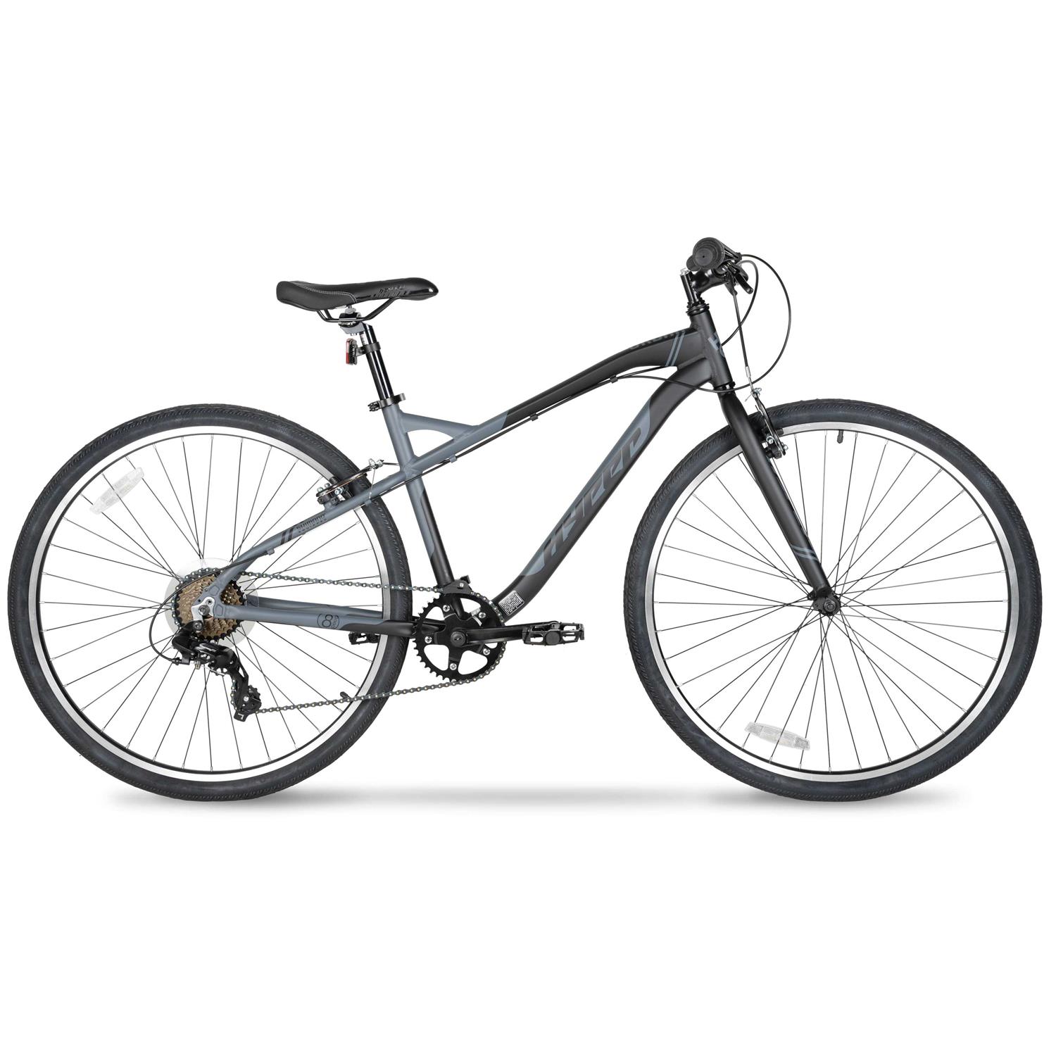 Ride in style with Hyper Bicycles 700c Adult Urban Bike in black and grey. This bike is great for everyday riding on smooth trails and paved surfaces for fitness or your daily commute. The Urban Bike includes a 700c lightweight aluminum frame with 8-speed twist-shifters and a Falcon rear derailleur. For your comfort the bike includes front and rear linear-pull brakes alloy wheels and three-piece cranks. Perfect for your next trail ride or weekend leisurely ride the Hyper Bicycles 700c Adult Urban Bike is perfect for you.