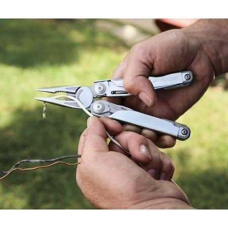 The Leatherman 830158 SURGE 18 Multi-Tool is built with tough new pliers, longer blades, 4 outside-opening blades and easy-to-use locks. Unique blade exchanger comes with saw and diamond/wood file blades. Large and small bit drivers include double-ended bits. Four outside-opening blades give you quick access to the tools you use most. The tool features Leatherman’s strongest scissors yet.The multi-tool comes with a leather sheath. The 12.5-oz SURGE is 7″ open and 4.5″ long closed.