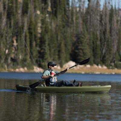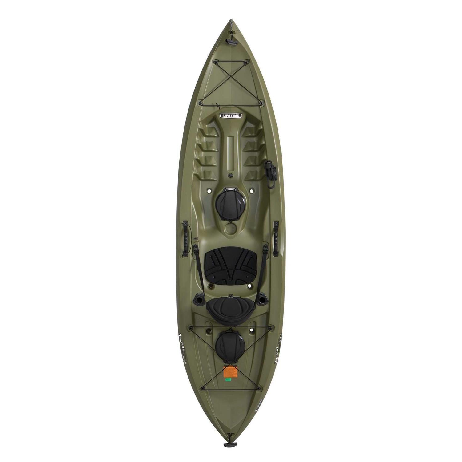 The Lifetime Tamarack 10 ft. Angler Kayak is a sit-on-top fishing kayak that has a comfortable padded seat and backrest for your long paddling and fishing adventures. Designed for extreme safety and stability, the Tamarack Angler has a stable flat bottom with deep tracking channels and stability chine rails. The kayak is constructed of blow-molded high-density polyethylene (HDPE) making it durable, UV-protected, and impact resistant. The 52 pound design and front and rear carry handles make it easy to transport to and from the waterfront. With fishing rod holders, shock cord straps, multiple footrest positions, and two storage hatches, this kayak has plenty of extras to enhance your paddling and fishing experience.