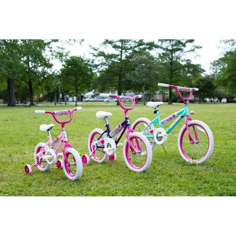 Your little one will experience nothing but the sweetest rides on the Magna Sweetheart 16-inch Girls Bike by Dynacraft. This bike is sure to capture attention with its eye-catching color scheme. The frame features a beautiful teal paint finish accented by pink handlebars and training wheels. Colorful details and custom graphics on the handlebar pad, top tube pad, and chain guard are all decked out with pops of yellow, blue, and purple. Coaster brakes make stopping easy and removable/adjustable training wheels help ensure a fun and steady ride for those just learning to ride. The 16-inch tires make this a great option for young riders ages 4-8 years. Spread some love in the neighborhood on the Sweetheart 16-inch Girls Bike.