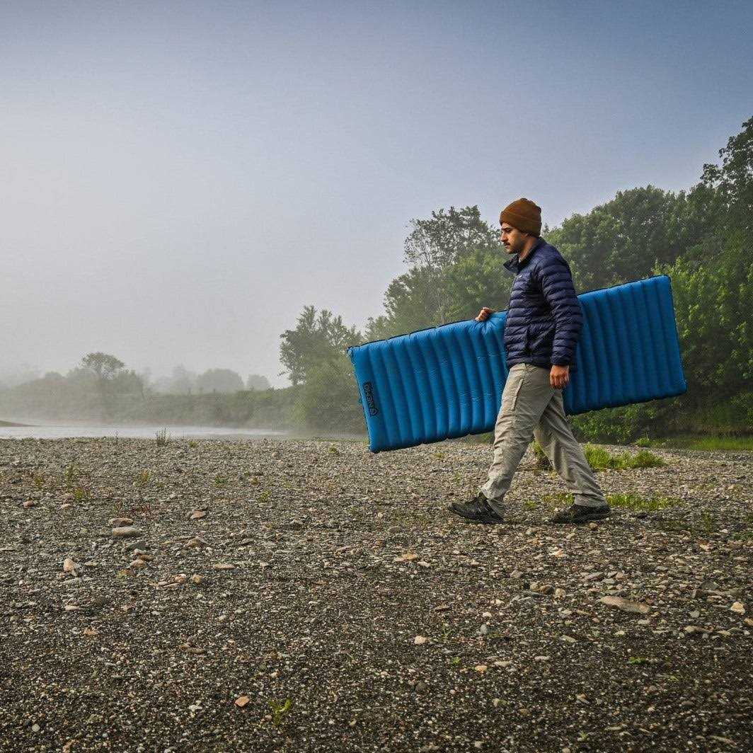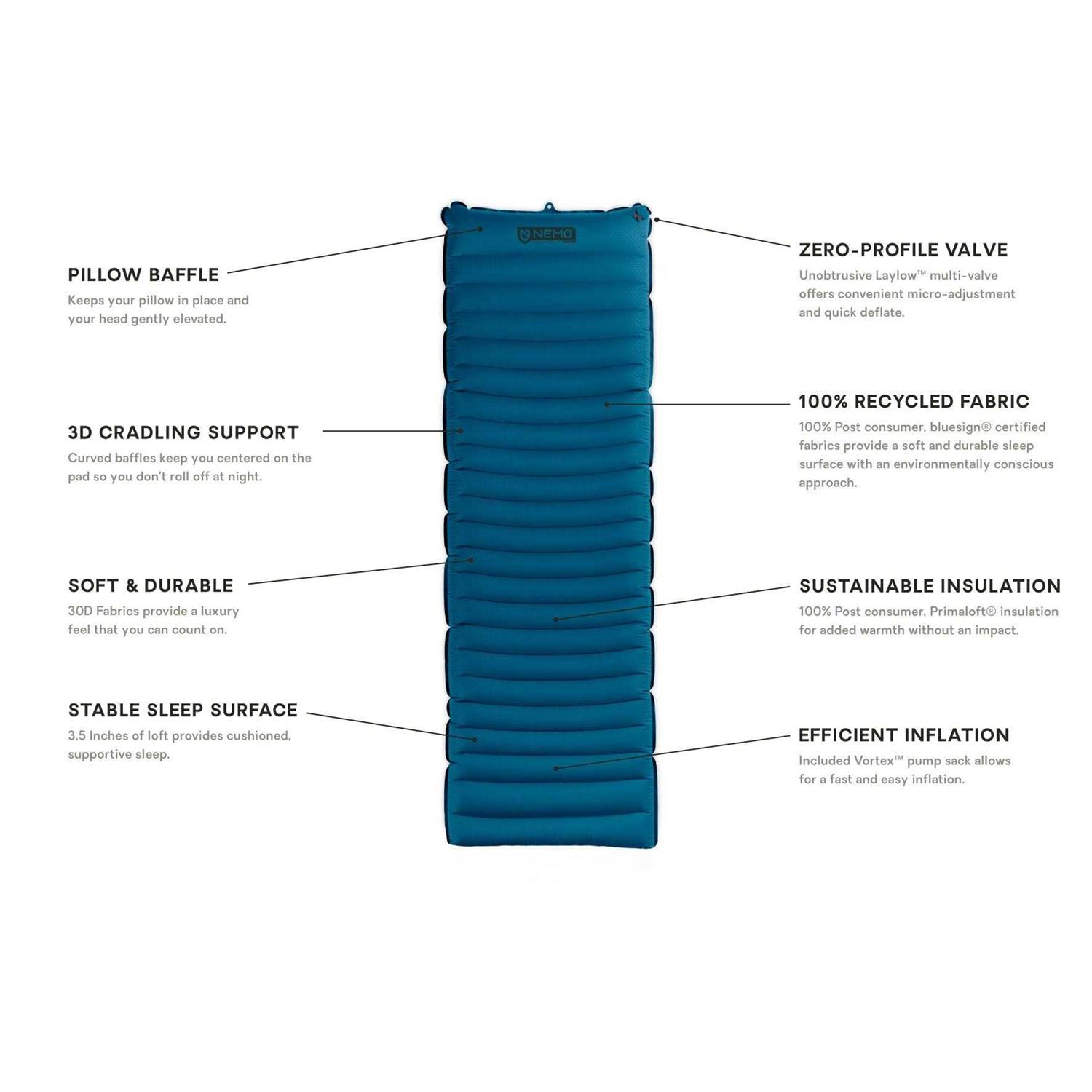 A Quiver Killer for Any Adventure! Newly added to the collection, this rising star utilizes our body-mapped 3D baffling to gently cradle and keep you centered on the pad during the night. The slightly elevated head baffle serves as a headboard, helping to keep your camp pillow in place. Packable, durable, and weight conscious, Quasar is a great versatile option for any adventure. Quasar 3D makes a leap forward in sustainability with our first ever bluesign Certified sleeping pad. The durable 30D polyester ripstop is made of 100% post-consumer recycled materials that conform to the body and have a great feel. Our custom Laylow zero-profile, multi-functional valves, combined with our included Vortex pump sack, allow you to inflate and deflate quickly and easily make micro adjustments for maximum comfort.