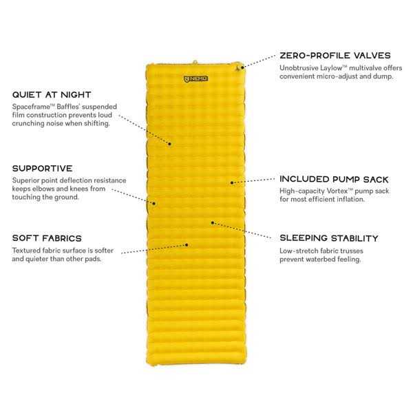 When youre on the trail, sleep isnt a luxury, its a necessity. Getting the most from your experience in the mountains requires enough rest to be fully present, and few things are more essential for a night of rejuvenating sleep than a good pad. Built on Nemos iconic proprietary Spaceframe baffle construction, Tensor offers quiet, supportive comfort in an ultralight package. The internal architecture provides unparalleled stability and weight distribution, using low-stretch die-cut trusses to eliminate springiness while protecting elbows and hips from poking through to the ground. A new internal layer of ultra-thin film reduces convection currents and adds R-value. Insulated versions utilize multiple layers of suspended Thermal Mirror metallized film, resulting in a lighter, remarkably quiet sleeping pad compared to the competition. Tensor now features 100% bluesign certified, recycled 20D polyester fabrics. It comes with the Vortex pump sack which mates with their custom Laylow zero-profile valve for easy inflation and personalized comfort. If having your best adventure depends on good sleep, Tensor has the perfect formula.