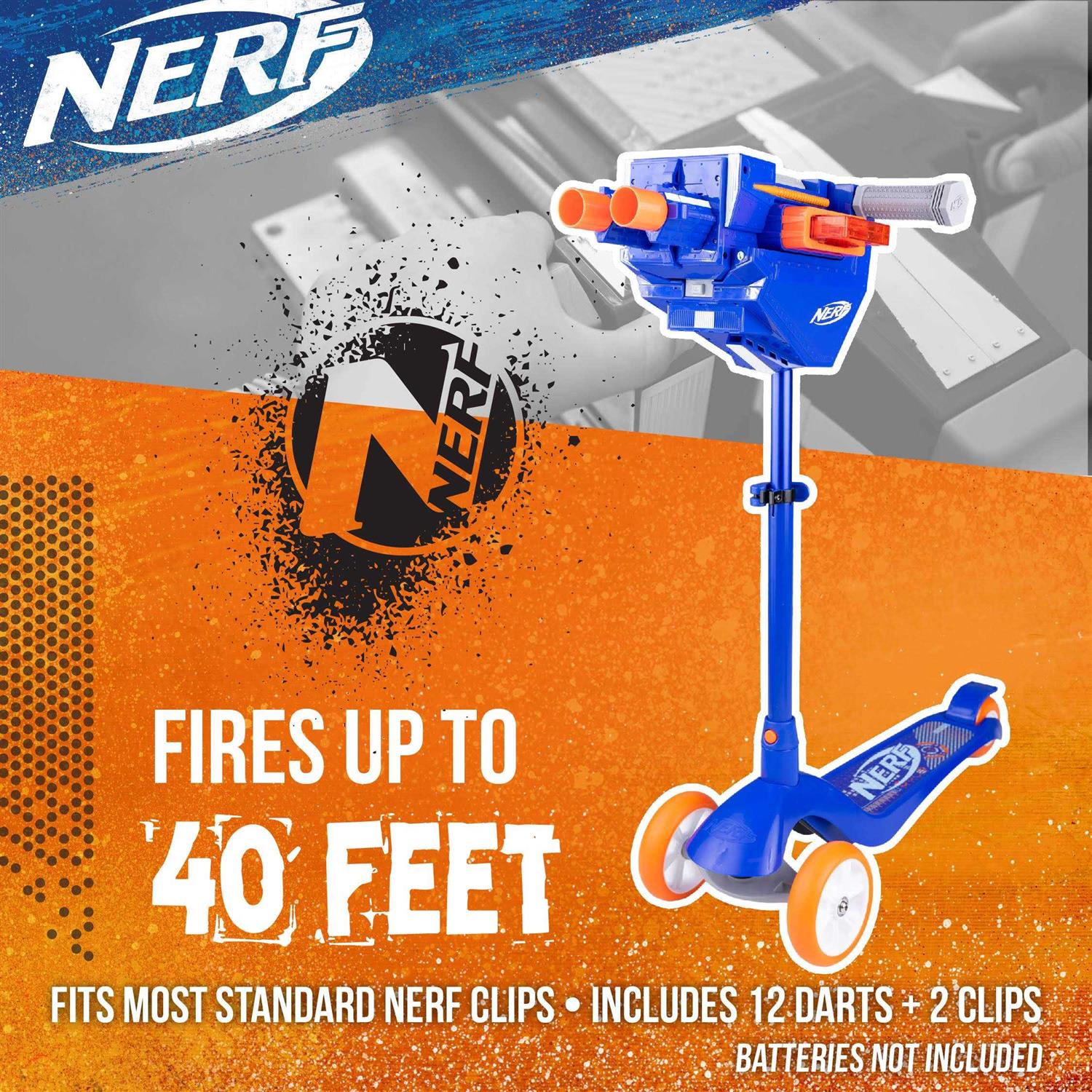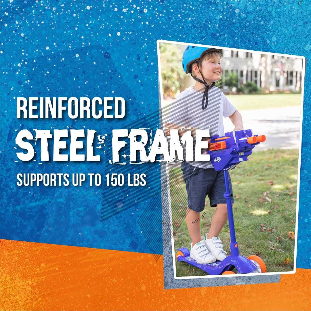Blasting on the go just got epic with the Nerf Blaster Scooter. Experience rapid fire, dual barrel power on a smooth and responsive 3 wheel scooter. Unleash dart-fire action with easy-reach trigger buttons and a blast range of up to 40ft.Charge into battle or get out of the mayhem fast on the Nerf Blaster Scooter. The steel enforced deck and brake and oversized PU wheels provide a safe and durable ride.Helmet and protection set sold separately.