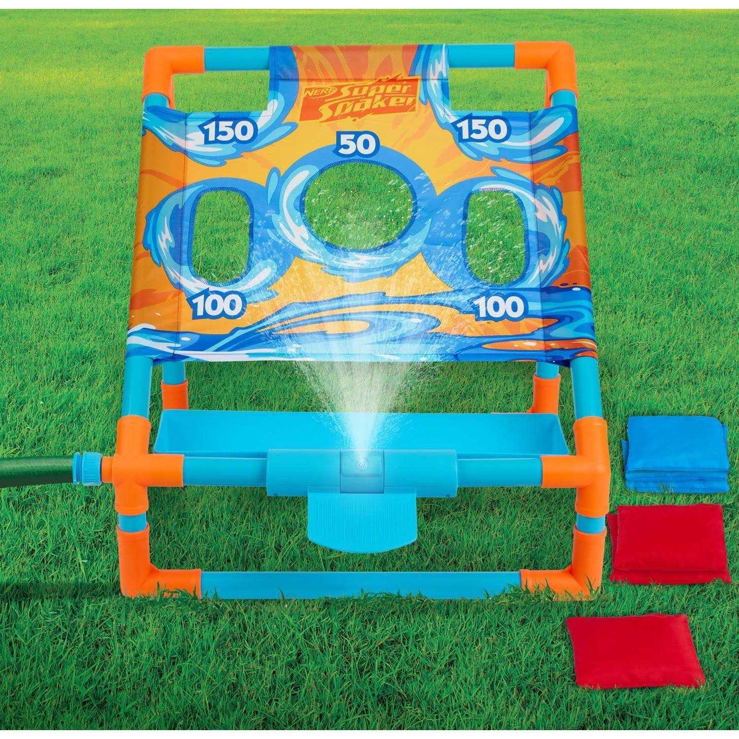 Family favorite bean bag toss game with a splashy twist! All-new from WowWee, the Super Soaker Toss N Splash is the bean bag toss game that loves to get you soaked! Just like traditional bean bag toss, players toss bean bags at a target, trying to score points. But now, if you accidentally hit the penalty zone, youll get SOAKED! Toss bean bags at the 50, 100 and 150 point zones. If you miss and hit the penalty zone, water starts spraying, but you still have to finish tossing all your bean bags. The penalty zone is easy to reset after each round, and the first player to 300 points wins. The frame easily attaches to your hose, and the target and bean bags are made of water resistant nylon fabric that dries quickly. Fun for the entire family, you can play Toss N Splash solo or in teams. Its a blast for everyone 6+. Included in your Toss N Splash Game are 1 Fabric Board target, 1 Penalty Zone tray, 6 Bean Bags, 9 Tubes, 7 Connectors, 1 Hose Adapter and an instruction manual. Some assembly required.