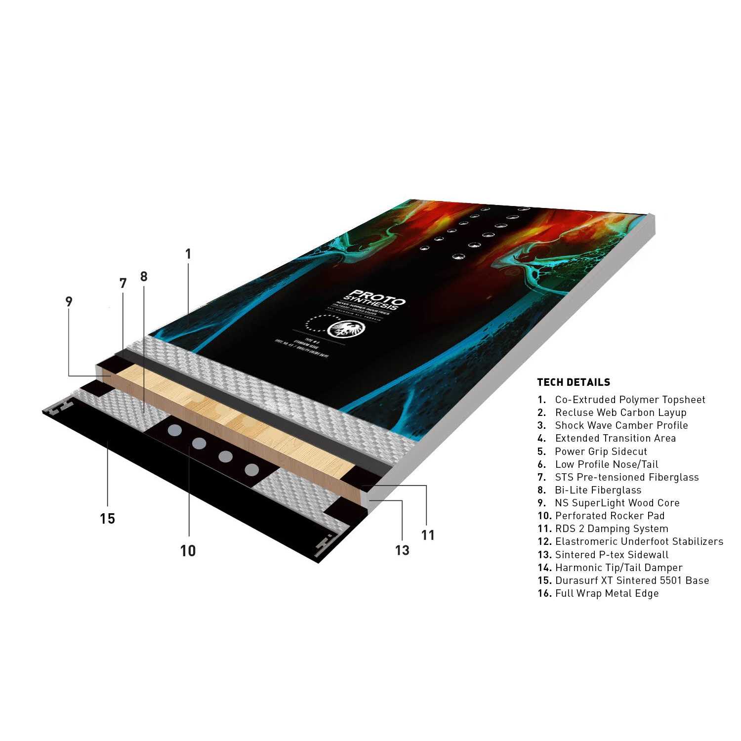 The ProtoSynthesis features Never Summer’s ground breaking Shockwave Rocker Camber Profile with extra long camber areas for huge pop and stability. The Rocker area is reduced for quicker turn initiation and float. With a mid-flex and a Superlight Wood Core, this board sets the standard for all-mountain riding; and now the benchmark has been boosted.