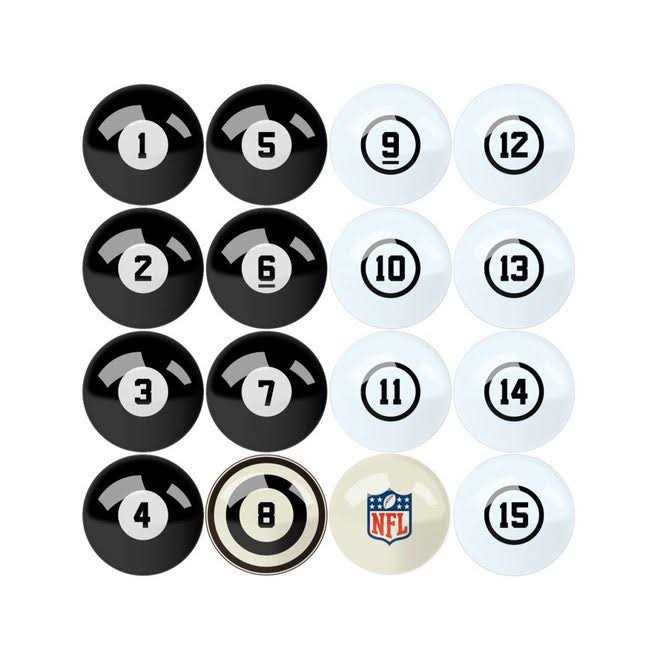 This awesome Las Vegas Raiders billiard ball set comes complete with referee eight ball and NFL cue ball. Tournament grade, regulation size and weight polymer resin pool table balls, colors and logo are perfectly matched to your team. You no longer have to play 8 ball or 9 ball with just solids and stripes, now you can play pool in style with your favorite team. Invite all the neighbors over for game day and enjoy! An excellent gift idea for your favorite NFL fan.