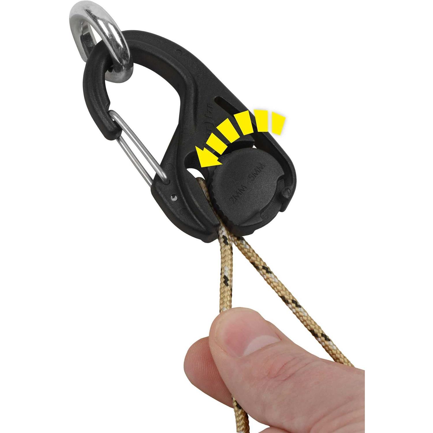 If your knot-tying skills are a clove hitch short of Eagle Scout, you’ll want this set of (4) CamJams, cord-tightening carabiners. In sturdy black plastic with stainless steel gates, there are (2) ways to use them, a loop or fixed-end system. Anchor the carabiner to any hook, D-ring, or loop and feed your cord through, then pull firmly until the cam locks. Sounds ridiculously easy, does is knot? Works with 1/16″ to 3/16″ diameter cords.