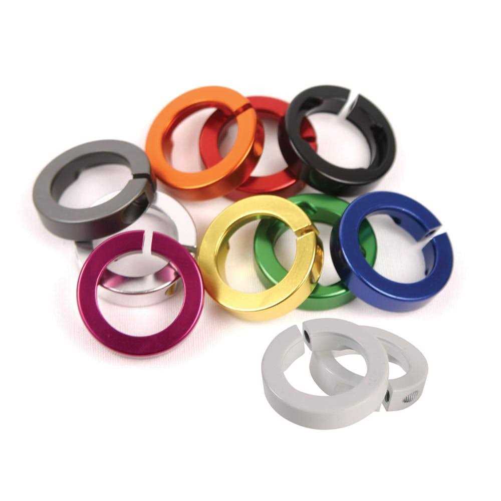 Four aluminum collars (2 per grip) with set screws and hex wrench. Must be used with Lock On grips. The clamps can be reused if the grips are changed.