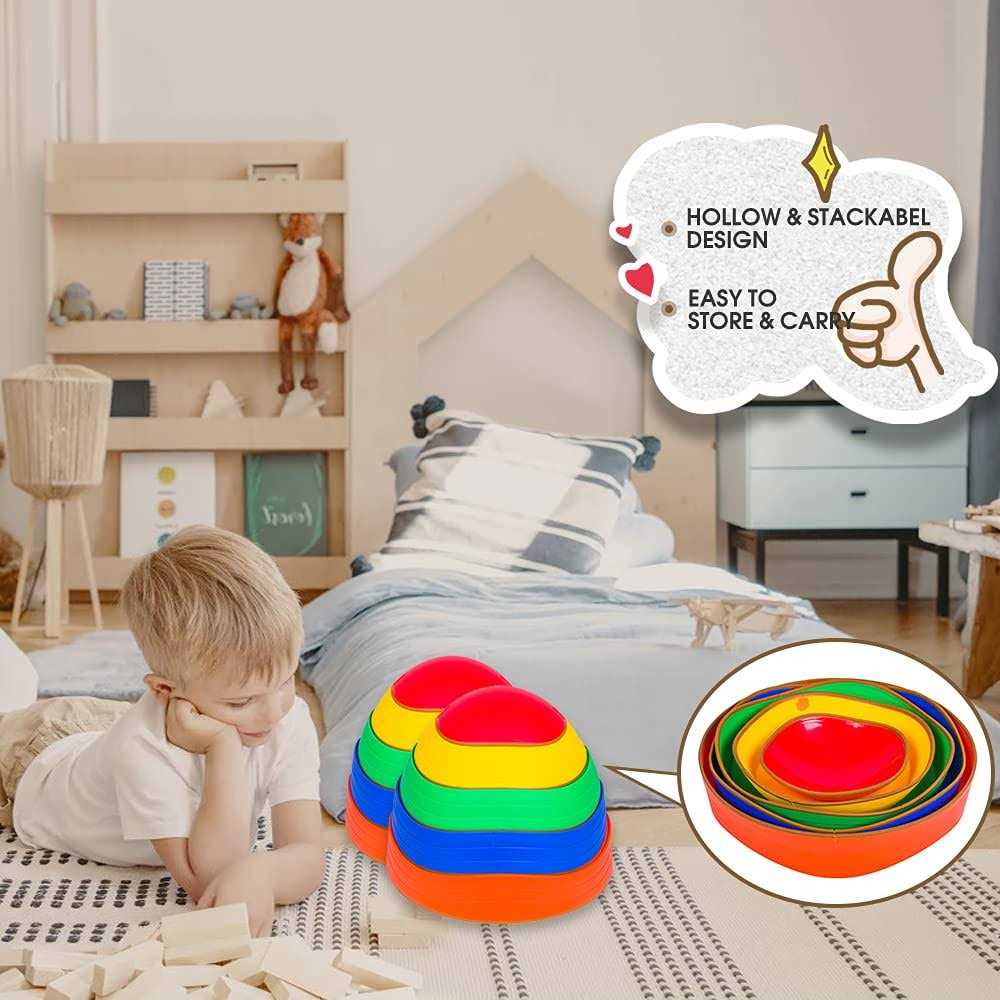 OMNISAFE Balance Stepping Stones for Kids help your child build confidence in their balance and coordination. Playing with the stepping stones kit helps them learn to determine distance and height. This set is suitable to play with parents and friends, which can help kids to enjoy the fun. In addition, this stepping stones can be stacked up for easy storage without wasting too much space. It can also be widely used in kindergarten, kid room and early learning centre. Colorful kids balance stones give kids endless fun! Features: ASTM F963 and CPSIA certified, made of high quality PP plastic, which are non-toxic and odorless to protect kids health; Made up of 5 waves of different sizes and colors Stepping Stones to build confidence and balance; With non-slip silicone edge and texture surface, the stones can increase the friction atop carpet, tile, grass, hardwood floors, etc, to ensure the kids safety; The colorful balance rocks set gives children many educational games; Balance stones can be stacked to save storage space; Waterproof surface for easy cleaning and maintenance;PROP 65 WARNING: This product can expose you to some kind of chemical, which is known to the State of California to cause cancer.