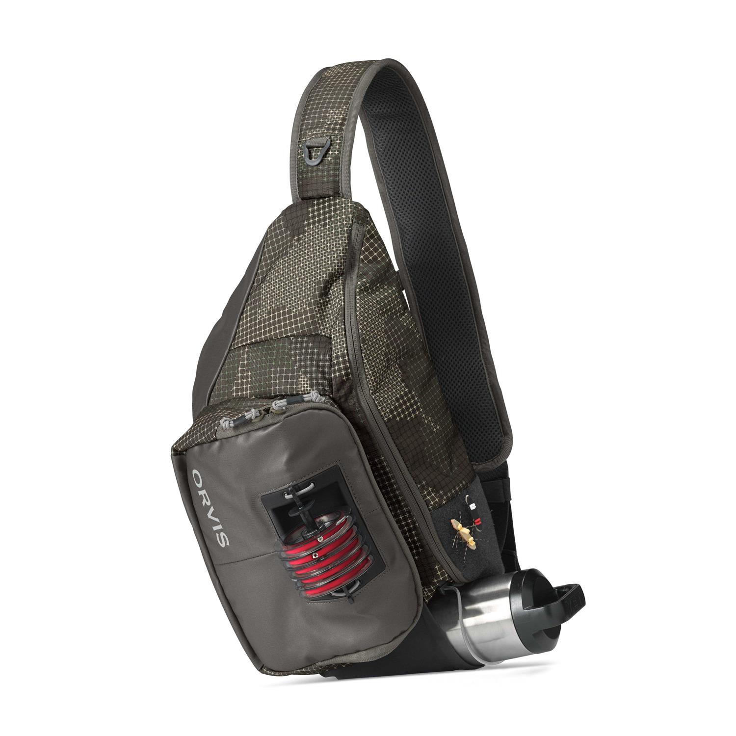 The best-selling Orvis fly-fishing Sling Pack has been updated and improved not only for durability, but with innovative new convenience features as well. The 100% recycled CORDURA ECO platform is designed to store, organize, and offer easy, intuitive accessibility while staying completely out of your way when fishing. New features include the patented Tippet Whippet recessed docking station with tippet bar included for instant, fixed, and fumble-free access for up to six spools. Main compartment has zippered security pocket with key fob and stretch mesh pockets for small sort storage. Front drop-down has zippered pocket with elastic mesh slip pockets. Lo-pro zinger/nipper pass-through, easy swing handle, and water bottle holder with retainer. Front strap “dashboard” offers multiple docking stations for forceps and small tools as well as sliding adjustment for sternum strap. Left shoulder design frees up casting arm and shoulder.Tippet and accessories not included. 17″L x 9¾”W x 6½”D. 11L/671 cu. in.