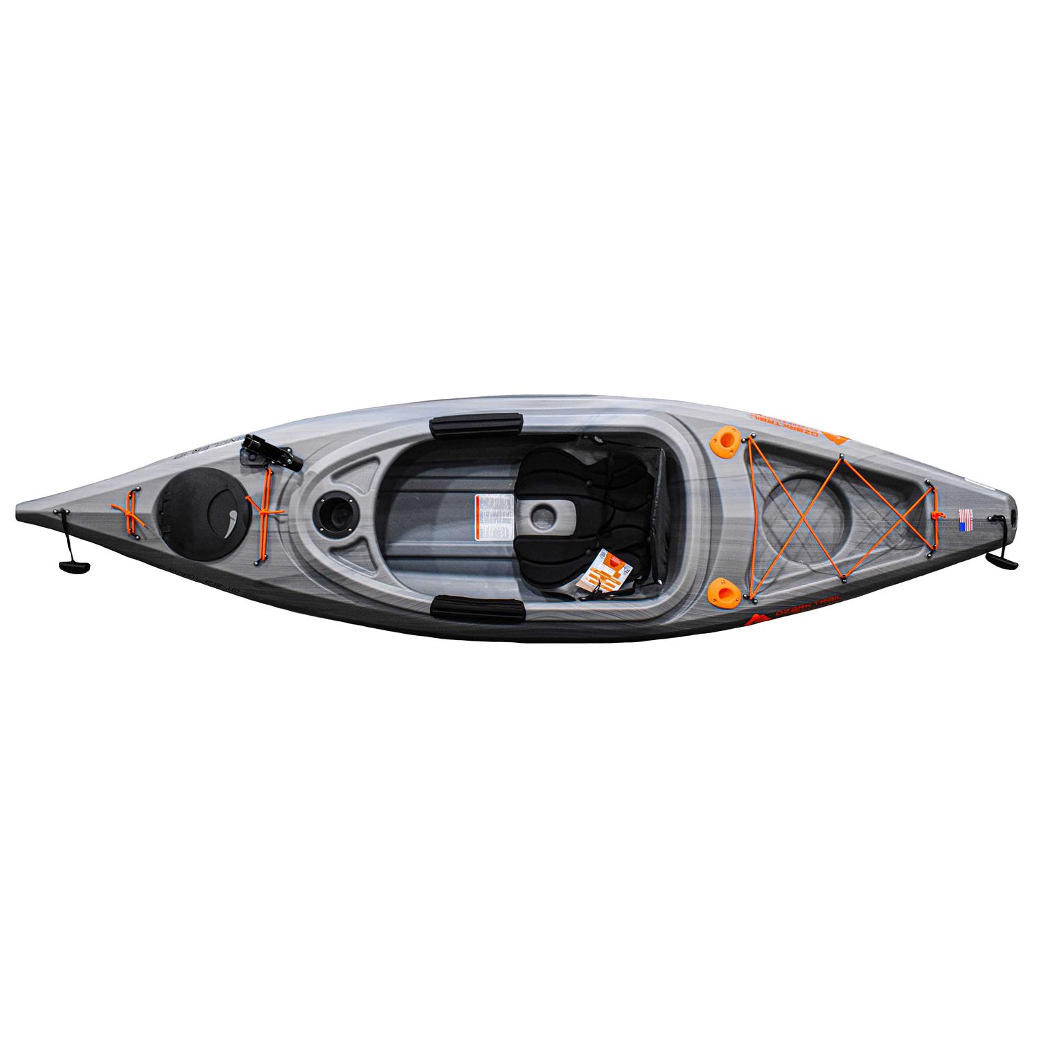 The Ozark Trail Angler 10 Sit-In offers a multi-channel hull for ultimate tracking and stability. Features include adjustable back rest and comfortable seat cushion, adjustable footrests, front camlock storage hatch, rear storage well with bungees, flush mount rod holders, swivel rod holder, tackle compartments, and paddle holder.