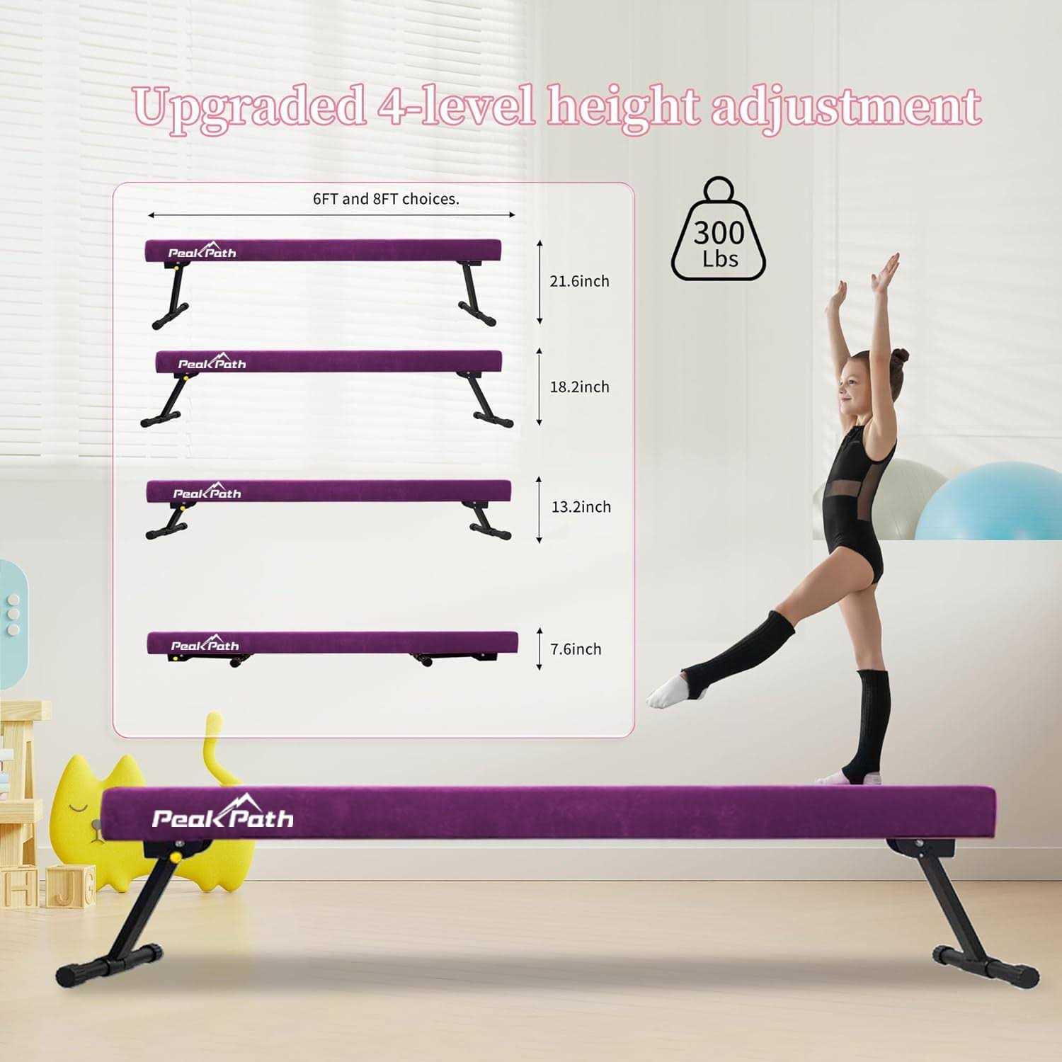 Fully Assembled&easy Storagepeakpath Foldable Balance Beam Was 100% Pre-assembled Gymnastics Beam,kids Just Need Adjust To Their Desired Height,lock It With Hand Bolt And Then Done. Since The Folding Leg Could Be Closely To The Wood Beam,so It Is Saving More Space And Easy To Store.solid Constructionpeakpath Gymnastics Beam,high-destiny Solid Wood Frame,heavy Iron Leg And Foot Base Built A Solid Foundation. Inclined Support Structure Provides Better Support And Increase The Stability.four Height Optionperfect Design Gym Beam For Beginners And Training Level 7 Or Below.8ft In Length,4 Width .floor Beam Height 7.5 And Adjustable Height From 13.4,18.5,22.5 Perfect For Turning, Walkover, Jumping, Leaping, Handsprings And Morenon-slip Surface:this Kids Balance Beam Is Covered In Suede-like Material.the Interior Of The Balance Beam Is 100% Solid Wood With A Nonslip Rubber Bottom.providing A Soft Sturdy Practice Surface And Sufficient Support For Kids And Adults.surprising Gift For Your Kidspeakpath Folding Gym Beam Is Totally Different From The Others,it Will Really Bring Surprises To Your Children,everything Is Easy To Handle,kids Can Adjust&folding It By Themself.is The Best Gift For Children At Child/teenager/junior’s Birthday, Halloween, Thanksgiving Day , Christmas And So On