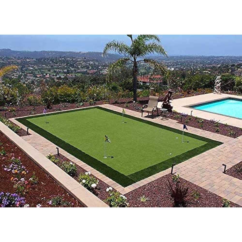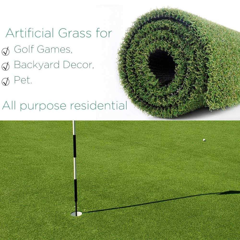 Premium Putting Green Grass: Grass height about 0.47in length 60 oz total weight per square yard. Thick high-density artificial grass for golf. PERFORMANCE :Made of high quality synthetic materialsuperior resilience and durabilityConstructed of the highest quality UV resistant polyethyleneensure an extremely high-density artificial grass.Rubber backed with drainage hole easy to clean and can be dry quickly. DURABLE LESS MAINTENANCE: With precise stitching UV-protection and weather resistant fabric. Just hose down the artificial golf turf with water and soap. Its built-in drainage system drains 23 gallons of fluid an hour making it easy to maintain. Use for indoor or outdoor golf practice mat mini golf gym baseball football sports school or even as a backyard decor.
