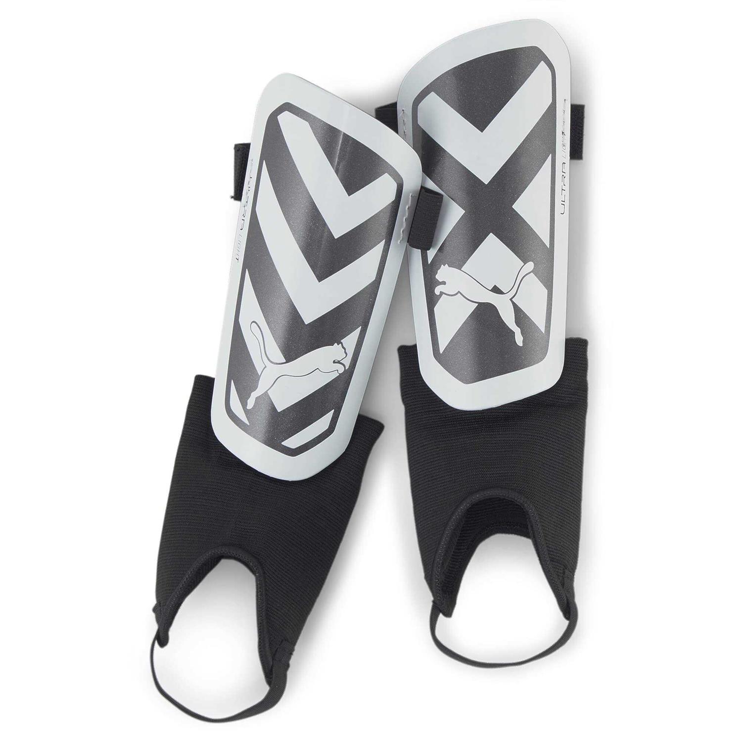 Puma Ultra Light soccer shin guards with ankle protection for kids and adults. The soccer shin guards have a breathable shell with a Velcro top strap to keep them in place and an ankle guard. Available in many colors, the shin guards are available from size XXS for small kids to XL to fit large adults !