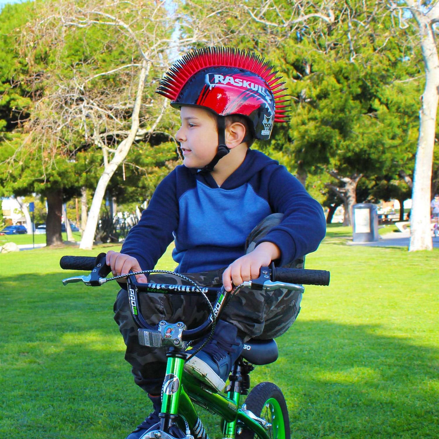 Finally a helmet that kids WANT to wear! This 3D Raskullz Hawk Mohawk helmet inspires imagination and encourages kids to be active outdoors. The bicycle helmet features an eye-catching 2-inch tall bendable red mohawk with black tips, and a totally rad stencil-style Raskullz graphic! The vented aerodynamic styling allows for great airflow and keeps your melon cool when riding. The child size helmet is recommended for riders 58 years old, but will fit anyone with a head measuring 5054 cm. Always take a head measurement. Head sizes and shapes can vary, even within an age range. Using a helmet that doesn’t fit can be dangerous. Complies with the US CPSC Safety Standard for Bicycle Helmet for Persons Age 5 and Older.
