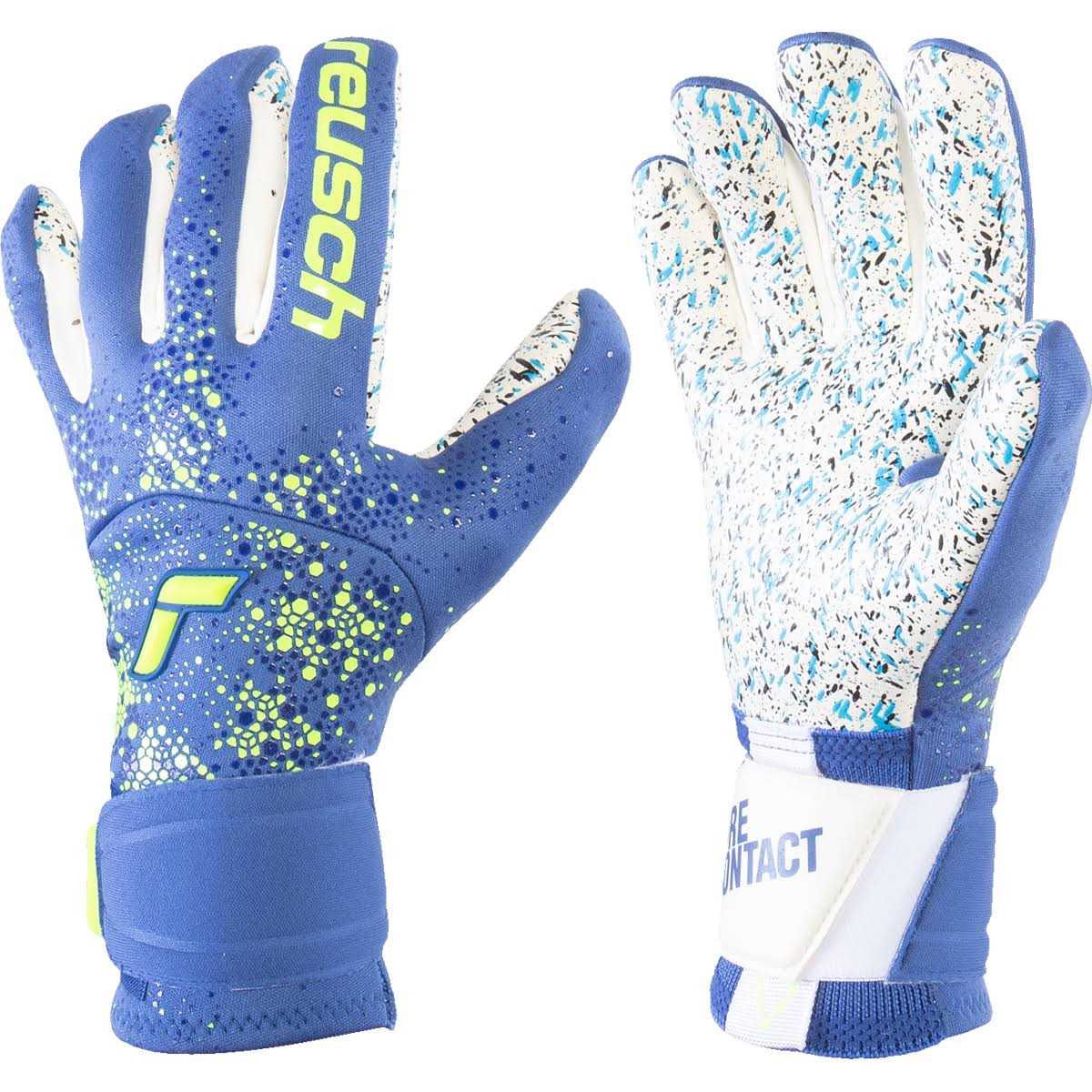 REUSCH FUSION FOAM Our newest German engineered foam palm. The Fusion foam is sprinkled with hard ground and soft ground foam for greater grip and durability. Pure Contact guarantees maximum grip in all weather conditions and very good durability. This ultralight goalkeeper glove provides a second-skin fit and maximum flexibility. This fourth generation Pure Contact has a shorter cuff for a lighter sensation and an easier entrance. PROFLEX 4-way stretch technology allows the glove more flexibility to move and yet retain a great fit. NEOPRENE ASYMMETRICAL SLIP-ON CUFF with integrated strap. Helps protect wrist area with longer coverage. EVOLUTION NEGATIVE CUT ESS The latex is seamlessly rolled around the fingertips for a tight fit, best ball control and maximized latex-to-ball contact area. 3D THUMB CROTCH offers rolled crotch construction eliminating open seams. The FreeFlex backhand is made of perforated neoprene with very small and thin silicone applications, to not impair the stretch and flexibility in any way.