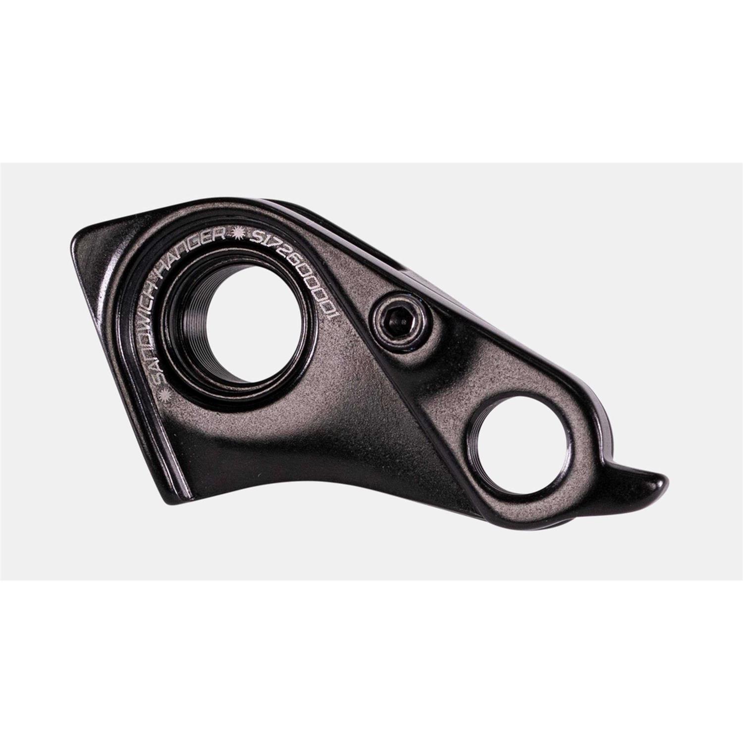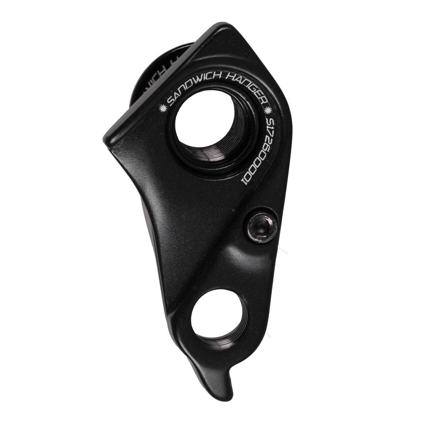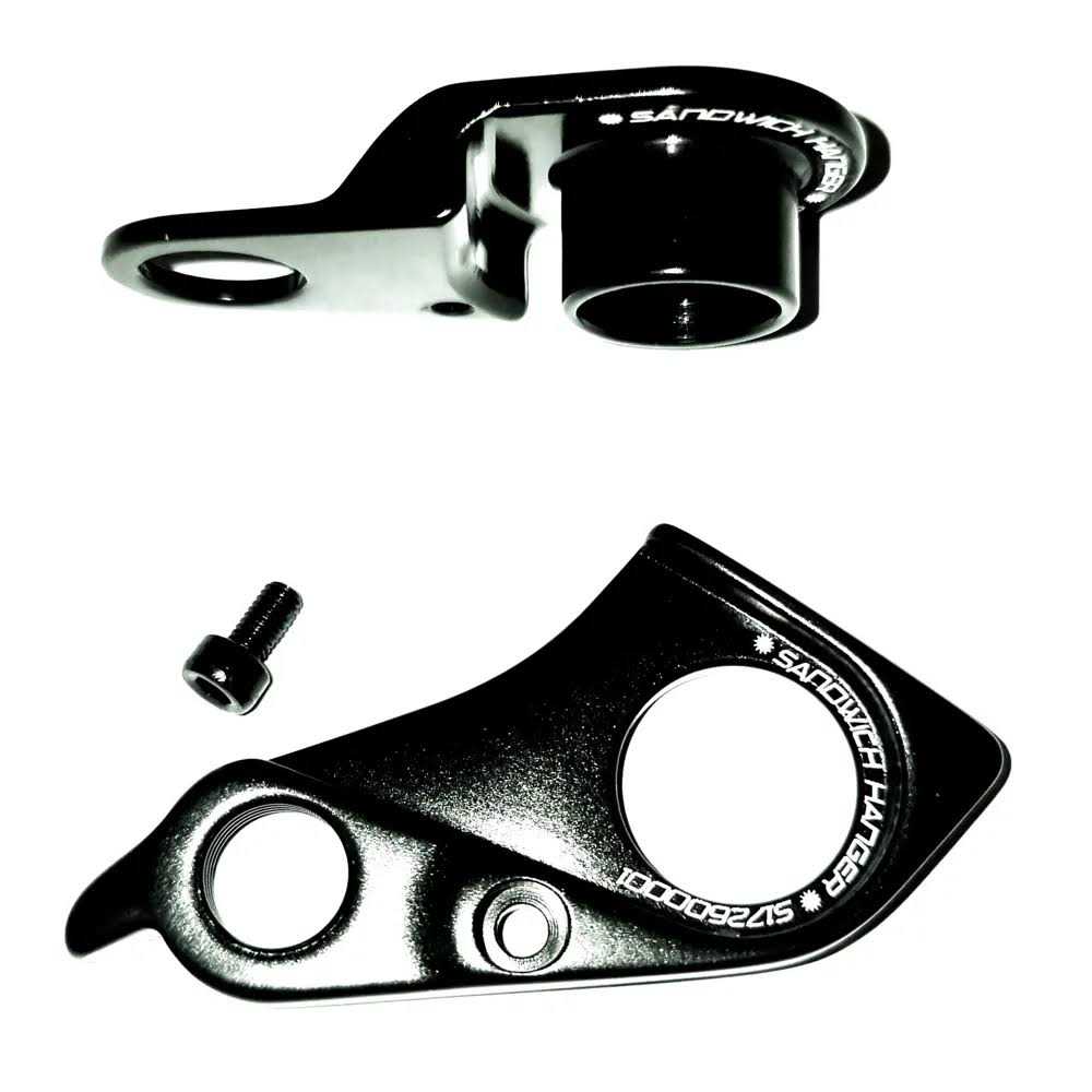 Mountain Bike rear derailleur hanger for many current models. Sandwich Derailleur Hanger used on many current Mountain Bike models. Black anodized finish. Includes M3 X 6MM Stainless Steel mounting bolt. Compatible with all derailleur manufacturers. Please confirm this fits your bike model using the application guide.