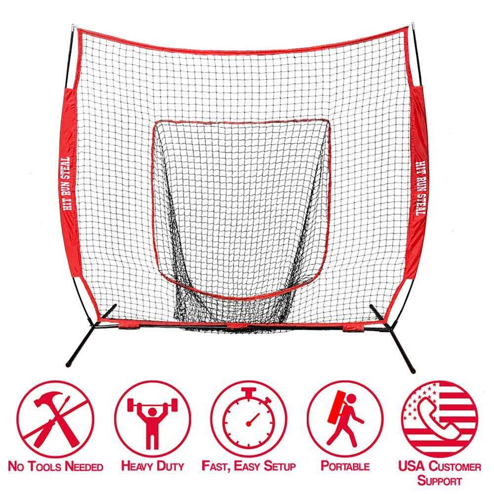 Baseball Hitting Net Hit Run Steal’s original baseball and softball 7 X 7 practice net with bow frame has become the most reliable baseball training net in the industry. See why Coaches, Teams, and Players everywhere all use Hit Run Steal’s Large Mouth Net Great for Baseball and Softball Large 7′ x 7′ dimensions No tools needed – sets up in 90 seconds Comes complete with net, ground frame, and composite Bow Poles Zippered carrying bag with straps included Can be used in place of a catcher – great for pitching practice Durable and Stable, weigh’s 12 lbs The perfect soft-toss net for any age group, t-ball to college players