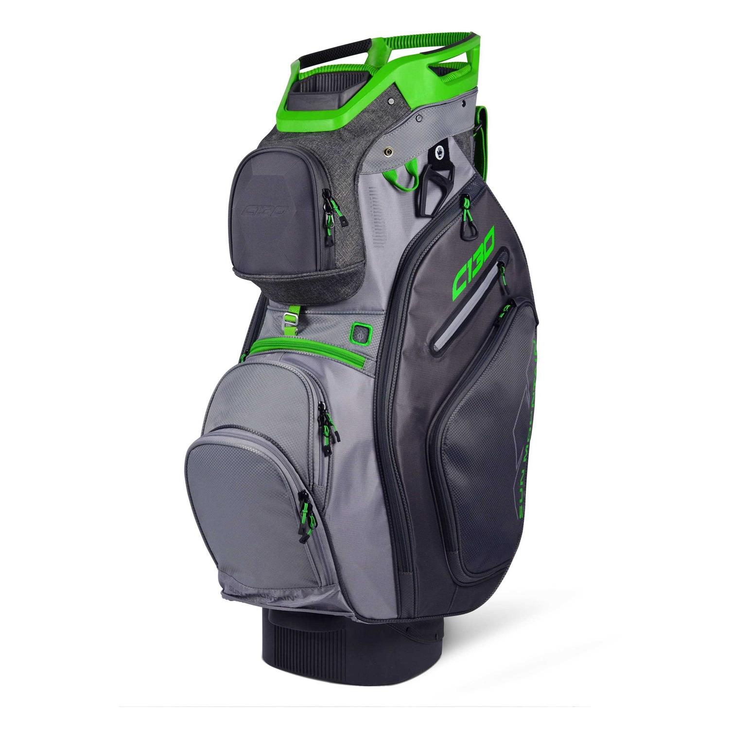 Sun Mountain’s best-selling cart bag, the C-130 was created to work optimally on a cart. All of the features are designed with cart use in mind, starting with the reverse orientation top with three utility handles, the Smart Strap System and a convenient, velour-lined rangefinder pocket. In addition, all pockets are forward-facing and accessible when the bag is on a cart. Matching rainhood included.