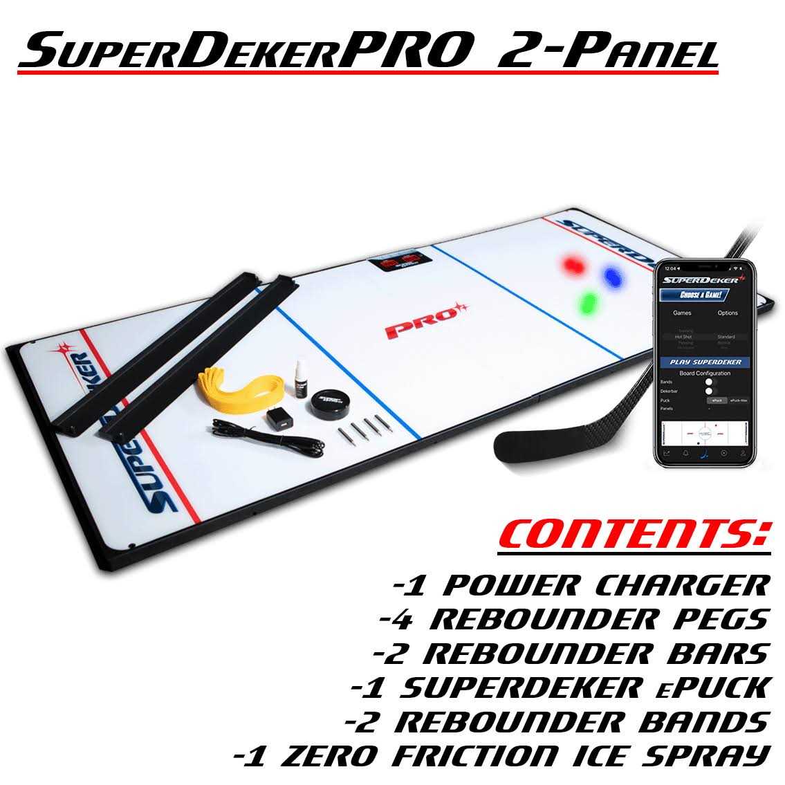 SuperDekerPRO BUNDLE: Keep on top of your game with the ultimate bundle from SuperDeker! INCLUDES: SuperDeker Pro (Two Panel), ePuck, 2 Rebounder Bands, Zero Friction Ice-Spray, Power Charger, Power Cable, 4 Rebounder Pegs, 2 Rebounder Bars. SuperDeker App PROFESSIONAL HIGH QUALITY ICE HOCKEY TRAINING ANYWHERE: Gain mastery over your shot, stick handling and more with our elite system! Cordless and easy to assemble, you can now train anywhere with our 2-panel setup or simplify with a one panel setup. REAL PLAY SIMULATION AND APP TO TRACK IMPROVEMENT: High quality displays and sensors keep the game exciting, effective and responsive. The SuperDekerPRO also pairs with the SuperDeker App allowing you to track your improvement and personalize your skill training. REAL ICE FEEL WITH A WEIGHTED PUCK: Low friction polycarbonate surface lets the puck glide for a real ice feel. It’s a regulation weight puck that plays and feels like a real hockey puck. Rebounder Bands provide fast, crisp pass-back action. ALL AGES AND SKILL LEVELS + EASY SET UP: While this system is designed to challenge elite players, it offers a range of difficulty levels and Two Player game options, making it suitable for everyone, from novice to advanced players. The board offers ten training modes designed to improve your skills with more options through the app. SuperDekerPRO | Advanced Hockey Training System Experience elite level training at home on the most advanced off-ice hockey training system available! Our SuperDekerPRO is the most advanced way to train off the ice. Each component of the game is designed to provide players with a realistic hockey simulation for effective training; from the weighted puck, to the real feel ice deck and high quality rebounder bands for fast, crisp pass-back action. Rebounder pegs and bars can be configured for extra challenges to your agility. Hone in on your stickhandling skills with precision, and train like a pro! This is an improved version of our original SuperDecker hockey trainer, made for advanced players. With ten built in training modes and more options through the app our system you will be able to increase your reaction time, speed and accuracy. The SuperDeckerPRO provides intensive individual training but can also be used for teamwork practice and Two Player fun. While it was designed for elite training, there are many challenge levels and modes to be enjoyed by anyone from novice to professional. The SuperDekerPRO has high quality sensors in the synthetic ice surface that can sense the location of the hockey puck, and features a high quality display for time and score. The pad is cordless and ready to go. The modular twp panel board can be set up in seconds and the low friction polycarbonate surface lets the puck glide for a real ice training experience. The SuperDeker ePUCK is designed with superior sensing technology and is regulation weight so it plays and feels just like a real puck! The SuperDekerPRO pairs with the SuperDeker App now available for download. Track your scores, switch between more than 11 included game modes options, and upload to the worldwide leaderboard with the SuperDeker App!
