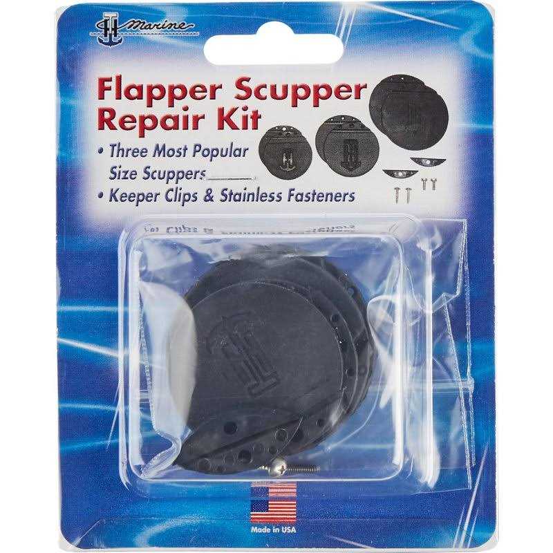 Our flapper scupper repair kit should take care of any flapper replacement job. The traditional flapper scuppers use molded rubber flappers that curl and deform over time, requiring replacement to prevent leaking. Our flappers are not rubber, but are molded of a thermoplastic elastomer that is resistant to UV and the elements, so they do not curl like the rubber flappers. Repairs most scuppers with flappers, regardless of manufacturer. Kit contains all parts needed to repair two scuppers of a given size. Each kit contains two each of the following: 1-5/8 inch flappers, 1-7/8 inch flappers, and all necessary keepers and fasteners.