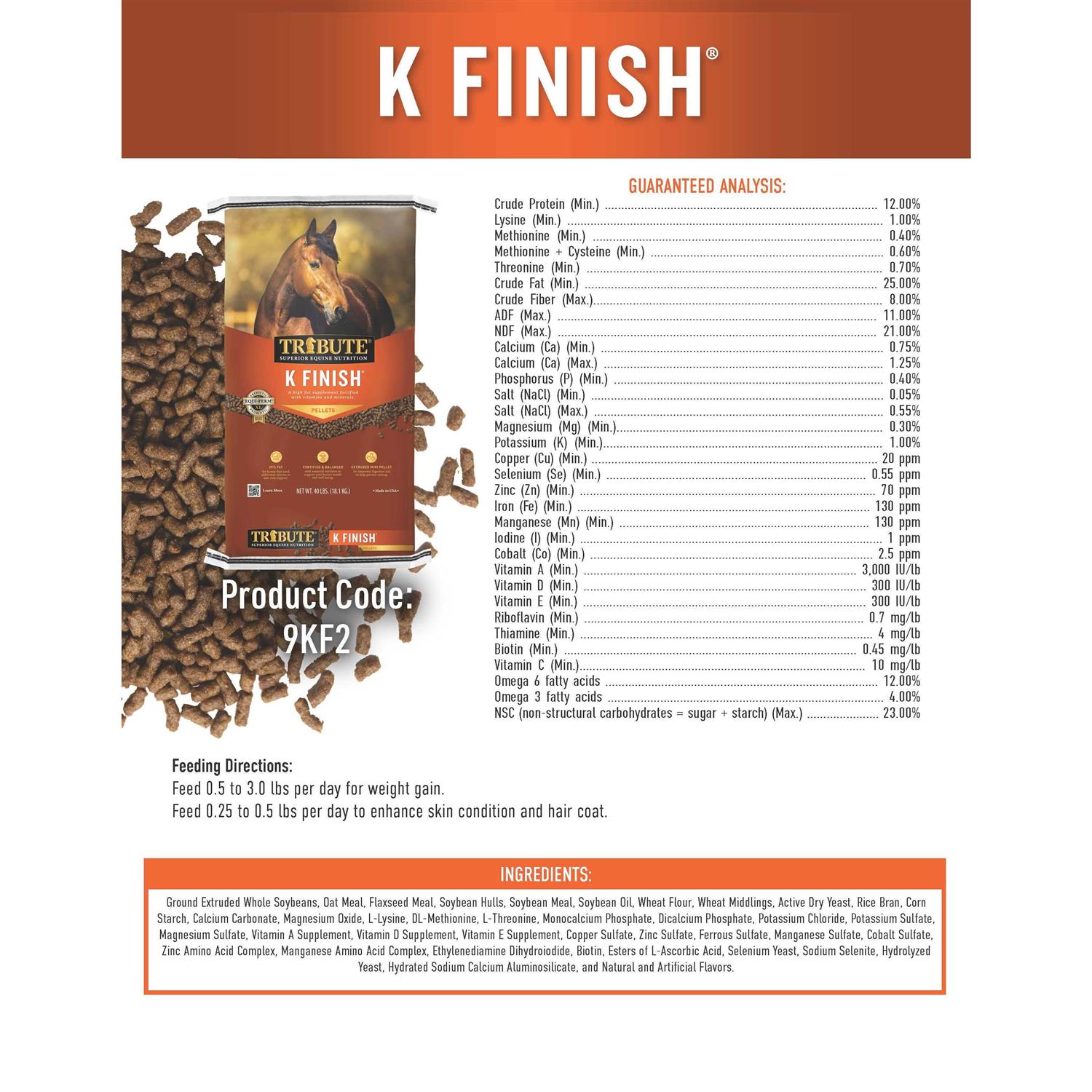 If you need to add fat to your horse’s diet, start feeding him Tribute K Finish High Fat Horse Supplement—specially formulated with a blend of full-fat soybeans, flaxseed and rice bran to provide a 25% high-fat fortified supplement. Suitable for all classes of horses, this pelleted supplement is especially beneficial for hard-keepers and horses requiring less sugar and starch in their diet. These hearty horse pellets are fortified with vitamins, antioxidants, organic minerals, essential amino acids and fatty acids, to help your horse flourish.